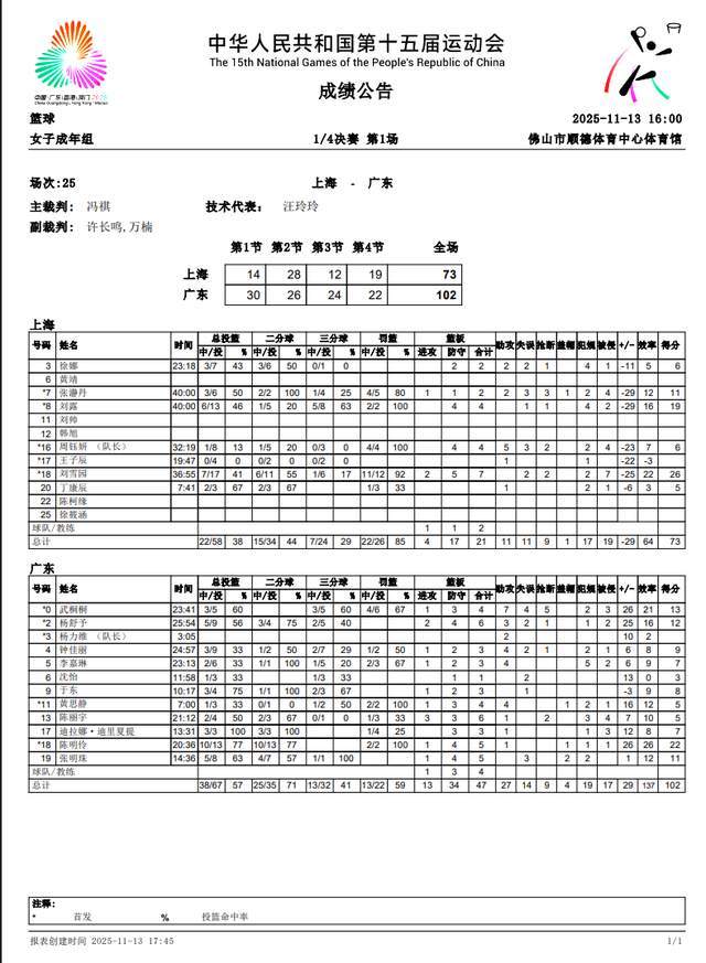 廣東隊12人登場,除了帶傷只打了3分鐘的楊力維沒有得分外,其他人都有得分入賬,4人得分上雙,陳明伶22分6籃板,武桐桐13分4籃板7助攻,楊舒予12分6籃板3助攻,張明珠11分4籃板。